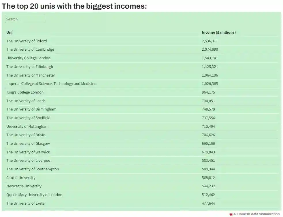 看完了大学的“富豪榜”后,我们再来看看哪些大学最会“赚钱”,以下是英国高等教育统计局(HESA)公布的2019/20学年,英国大学收入前二十的榜单: