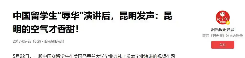 相比于在演讲过程中崇洋媚外的发言,杨舒平在社交平台上声称自己“深爱祖国和家乡”显得十分苍白,一番不恰当的言论不仅伤害了众多国民的情感,还会使不了解中国的国家和人民对中国产生误解和偏见。