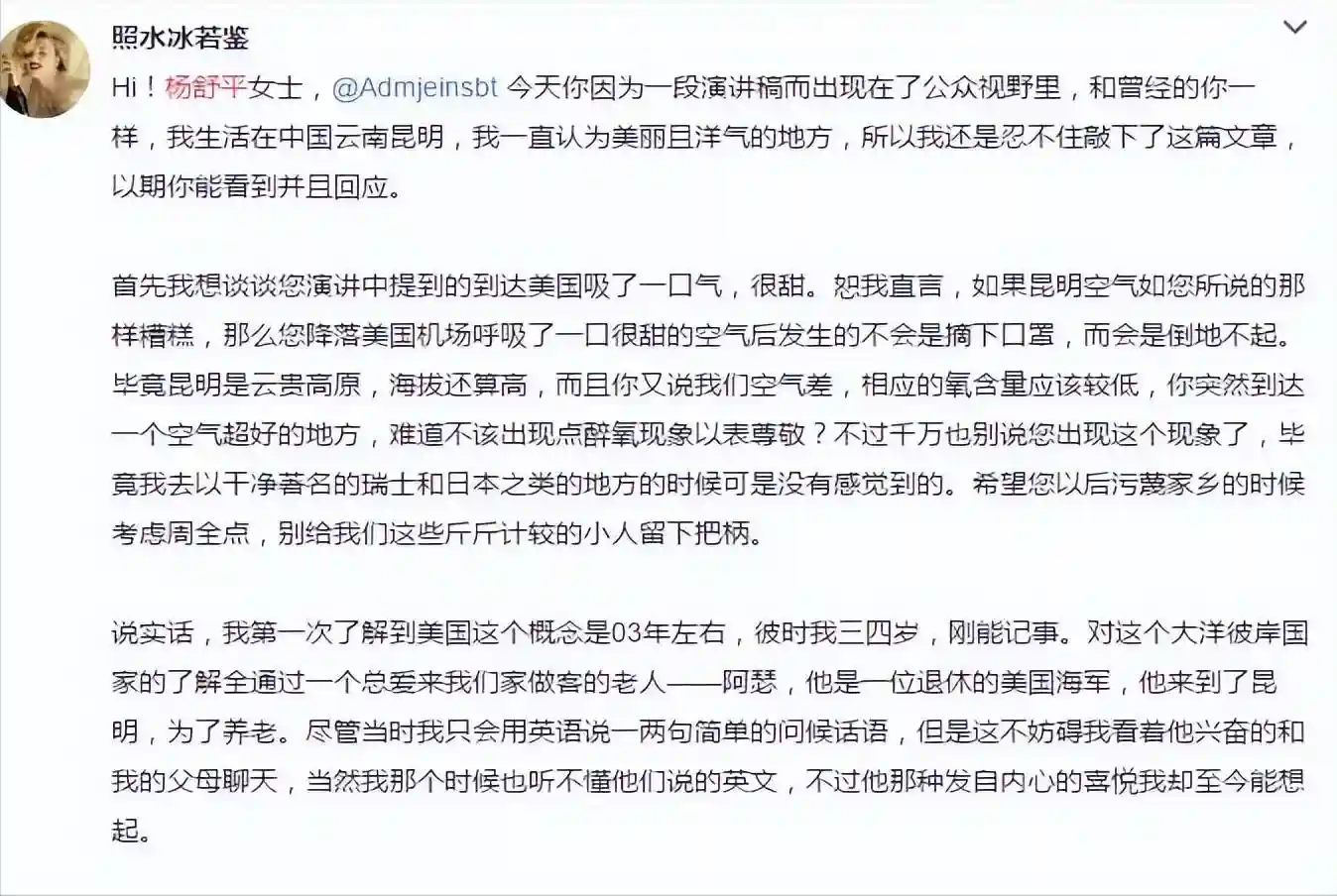 中国并没有哪个城市的空气质量差到了出门必须戴口罩,否则就会生病的地步,而且有网友翻出杨舒平的社交平台上写的她曾经在昆明的一所学校上学,昆明的空气污染指数更是不可能让人感觉呼吸不畅的,杨舒平的一番言论彻底激怒了众多国民。