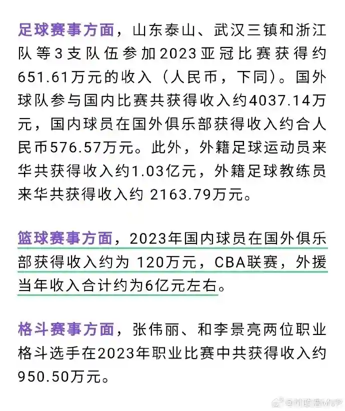 付政浩在个人微博上写道:“中国能走出去的高水平篮球选手实在太少了,导致中国篮球竞赛表演业的贸易逆差进一步被拉大。2023年国内篮球选手从国外俱乐部获得的收入仅为120万元,而该年度的CBA外援合计从CBA领走了约为6亿元薪水。该数据源于体育总局经济司近期在服贸会上发布的《2023年中国体育服务贸易发展报告》。