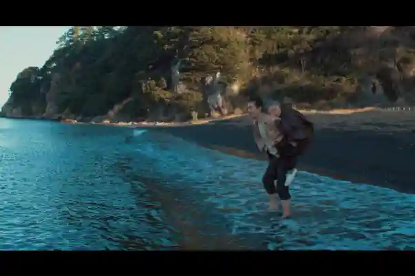 母亲怕水,只敢在海边轻轻试探,洪作背着母亲,站在海浪中间,说着小时候的故事,母亲趴在儿子的背上,悄悄地睡着了。