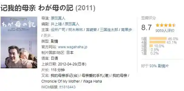 截止目前为止豆瓣评分高达8.7分,好于93%的剧情片,让人遗憾的是目前只有9000多条评价,算是小众电影里的佼佼者。