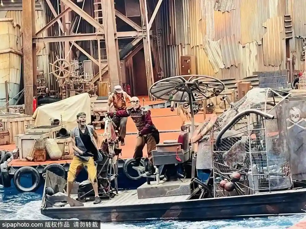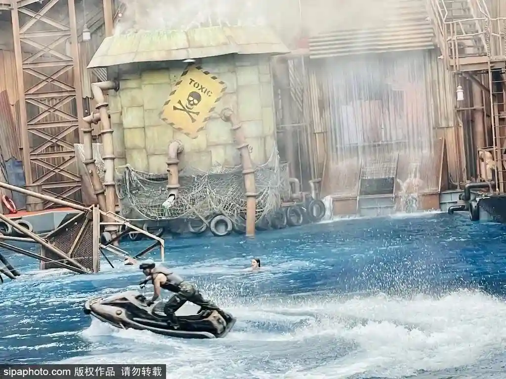 在未来水世界,游客观看环球影城首屈一指的水上爆破特技表演。从水上摩托艇急速俯冲的惊险特技,到触目惊心的飞机坠毁现场,游客将零距离感受扣人心弦的逼真体验。