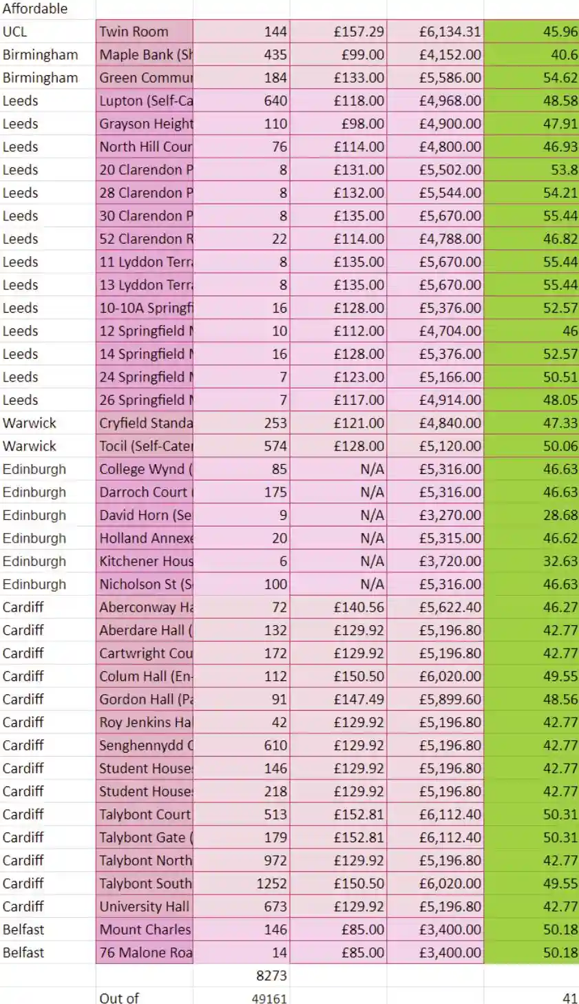 根据GenerationRent的一项新研究显示,罗素大学集团RussellGroup的9所大学校园里,只有16%的学生宿舍是学生负担得起的。关于什么是“学生负担得起”的定义,我们先来解释一下,英国学生联盟(NationalUnionofStudents,NUS)将一年的住宿费用小于最高学生贷款金额的55%定义为英国学生负担得起的金额,并要求大学提供的学生宿舍中,应该有35%的房间价格是低于这个价位的。但实际的调查结果显示,仅有16%的学生宿舍房间定价达到了这一标准,意味着还不到NUS要求的一半。