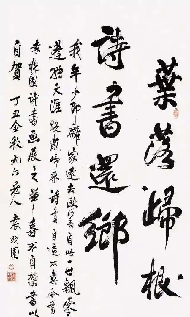 袁晓园先生身为一个女性,其书法却并不以秀美为追求,而是出之以大气、苍茫、雄浑。她擅长擘窠大字,在其百年书画展上,有一副“叶落归根”大字榜书,单字字径将近一米,气势撼人,纵是男性手笔也未必能及。