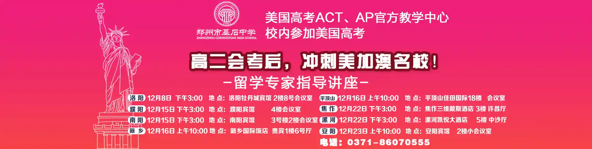 高二会考后的必然选择——郑州市基石中学,美国大学入学考试官方课程,12届毕业生成功直升美加澳一流大学:官方备考+系统衔接=成功留学,让每个孩子具有上世界名校的能力!