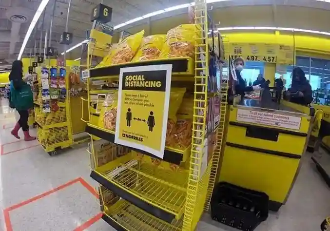 当地时间3月30日,加拿大大多伦多地区一家超市内贴出的告示提醒顾客,需保持社交距离。鉴于新冠肺炎疫情形势,多伦多所在的安大略省省政府当日宣布,该省的紧急状态于3月底期满后,将再延长两周时间。中新社记者余瑞冬摄