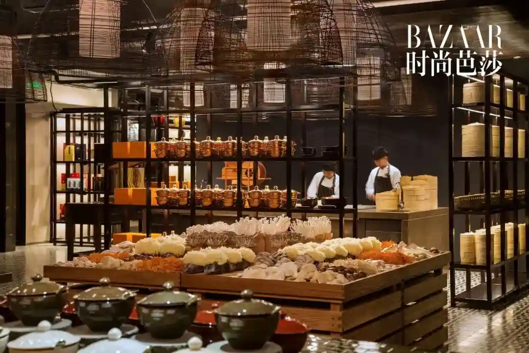 进入餐厅之前,都要先经过琳琅满目的“集市”亲身感受各种新鲜食材的味诱洗礼,淡水鱼、贝壳类海鲜及其他新鲜水产类食材种类繁多;各种肉类琳琅满目;厨师们精心制作的多款本地小吃一一陈列;装满应季蔬菜的木箱中满当季的菌菇,以及当地新鲜的蔬菜水果,品类繁盛,让您目不暇接。