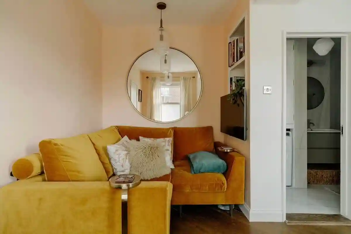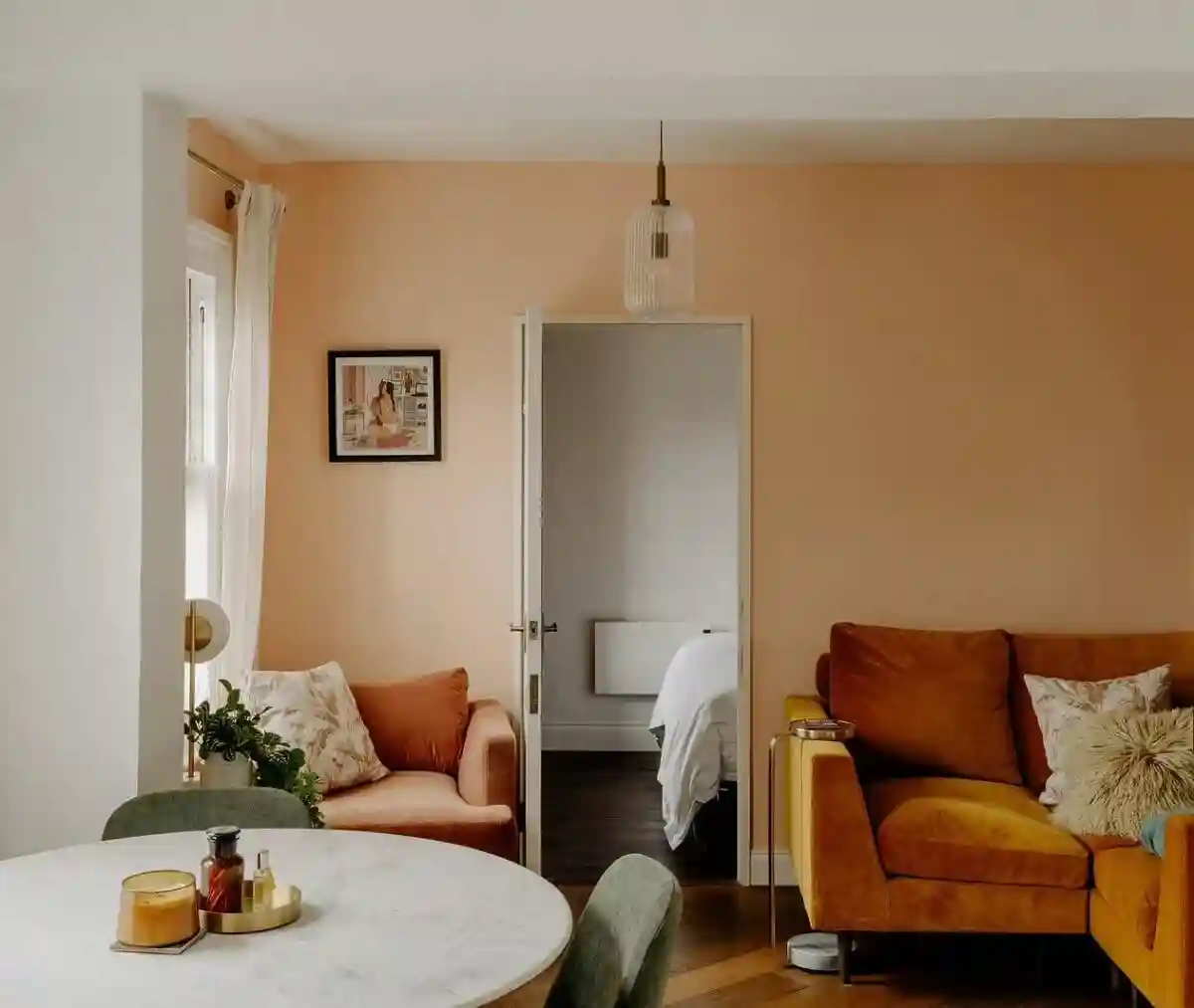 在这个小小的公寓中,巧妙地运用了温柔的低饱和度橙红色作为基础调色板,为整个空间营造出一种温馨而舒适的氛围。这种色调如夕阳余晖般柔和,令人感受到一种温暖又充满活力的氛围。为了更好地凸显这一色调,还选择了橙色丝绒沙发搭配,通过细腻的质地和优雅的色彩为整个空间增添了一抹华丽的质感。