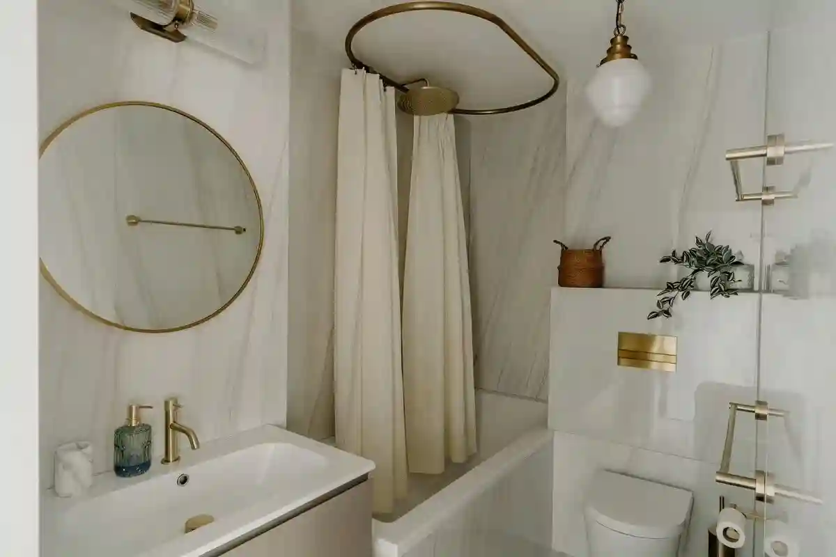 在小小的空间里实现了干湿分离和淋浴泡澡的享受,而且动线流畅,令人佩服。简洁的米白色,搭配圆形、弧形的纤细线条,衬托出金色五金的精致与华丽质感,如此优雅精致的现代格调,对于小家来说,很是不易。