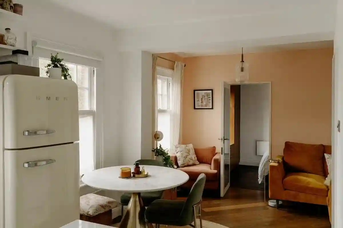 对于小户型而言,空间的合理利用直接关系到居住的舒适度。为了最大化利用空间,开放式设计,客厅与餐厨空间可以融为一体,营造出宽敞通透的视觉效果。而且与客厅的浪漫活力相比,餐厨空间以简洁的米白色为主调,营造出清新整洁的氛围。黄铜金属材质的五金、小圆桌和餐椅成为亮点,为整个空间增添了一份优雅和精致。