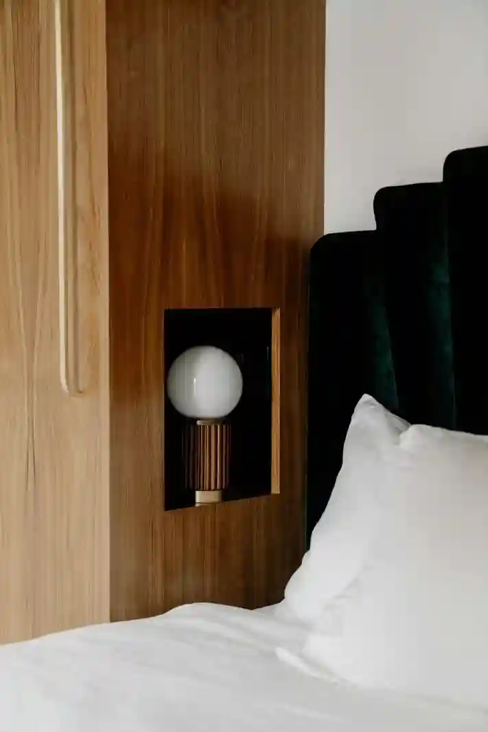 小巧的卧室被精心打磨和布置。被定制的原木色柜子包围的一扇小窗,选用了与床呼应的墨绿色窗帘,这种材质的窗帘不仅具有良好的遮光性,还能在阳光的照射下散发出自然的光泽。而且这个定制柜的设计也很巧妙,满足储物功能的同时也能坐在窗台看风景享受难得的惬意时光。