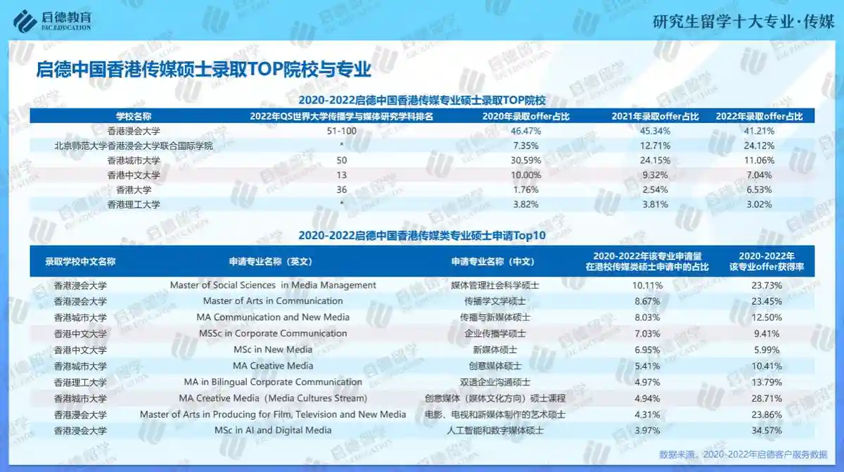 中国香港的地缘优势使得传媒行业既能立足本地,也具备面向全球开放文化的优势,120多家国际传媒机构在中国香港设立亚太地区总部和分社。启德留学客户服务数据显示,2022年中国香港传媒硕士录取前五院校分别为香港浸会大学、北京师范大学香港浸会大学联合国际学院、香港城市大学、香港中文大学、香港大学。作为亚洲第一的传媒院校,香港浸会大学传理学院每隔两年举办普利策新闻奖得主工作坊,邀请普利策新闻奖获奖者为学生授课。