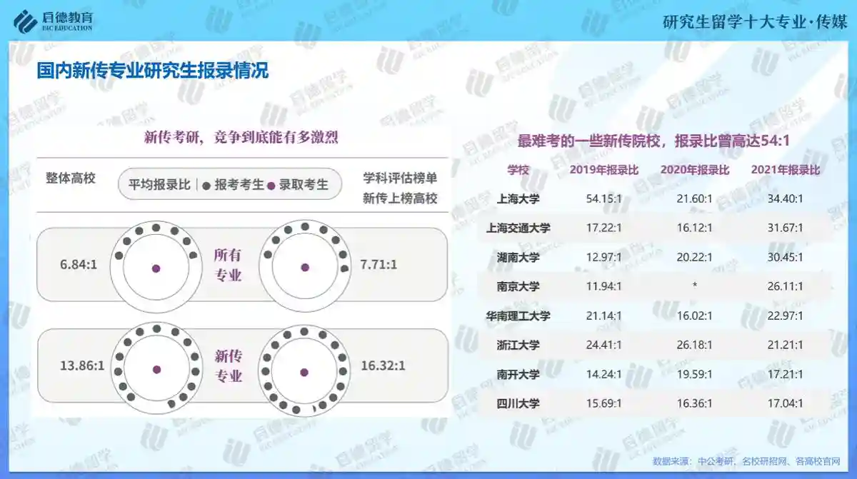 在近几年中国内地高校考研专业中,传媒专业被称为“最卷的专业”,据中公考研、名校研招网数据显示,近三年内地高校考研的报录比是6.84:1,新闻传播类学科考研的报录比达到13.86:1,2021年上海交通大学、浙江大学、南京大学新闻传播类学科的报录比均超过了20:1。启德留学客户服务数据显示,2020-2022年香港中文大学(2022年QS学科排名13)“新闻学”与“全球传播”硕士研究生专业的报录比均低于10:1,香港大学(2022年QS学科排名36)“新闻学”硕士研究生专业的报录比为4:1。香港城市大学(2022年QS学科排名50)“创意媒体文学硕士(可播放媒体与游戏研究)”专业的报录比为3:1。