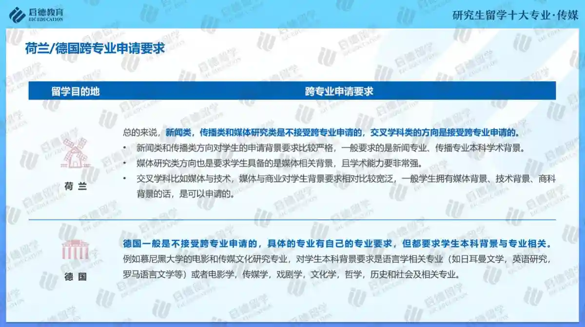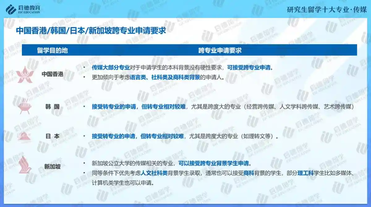 启德留学同时提醒,加拿大、荷兰、德国的新闻类、传播类和媒体研究类硕士研究生项目不接受跨专业申请。加拿大数字媒体方向更欢迎本科是数字媒体、计算机游戏设计、计算机工程、软件工程、新媒体等方向的学生申请。荷兰的传媒类交叉学科如“媒体与技术”、“媒体与商业”接受技术背景或商科背景的学生申请。韩国、日本接受转专业申请,但转专业相对较难,尤其是跨度比较大的专业。