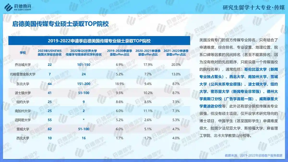 作为传媒业的发源地,美国一直是传媒教育的最高殿堂。美国有四大商业性广播网:ABC、CBS、MBC和NBC。启德留学客户服务数据显示,2022年美国传媒硕士录取前五院校分别为乔治城大学、约翰霍普金斯大学、东北大学、波士顿大学、纽约大学。其中,纽约大学的MCC媒体文化传播、与SPS学院下的IMC整合媒体营销是中国学生较常申请的硕士项目。