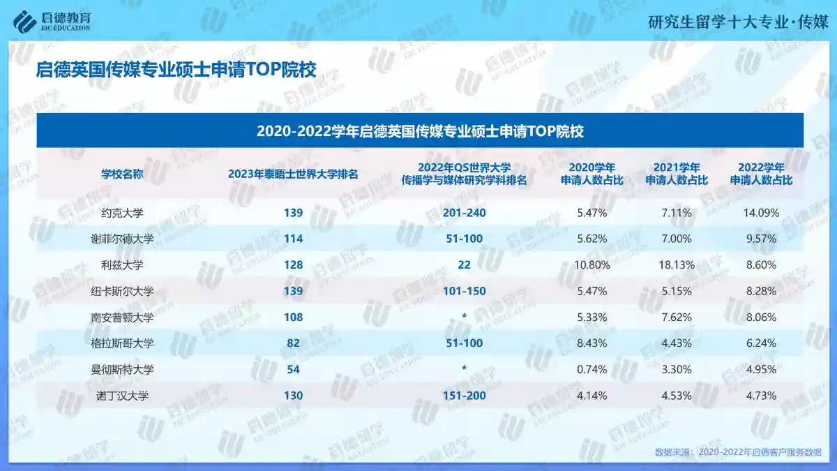 英国的传媒业同样非常发达,包括耳熟能详的BBC、路透社、泰晤士报、等。启德留学客户服务数据显示,2022年英国传媒硕士申请前五院校分别为约克大学、谢菲尔德大学、利兹大学、纽卡斯尔大学、南安普顿大学。其中,利兹大学的新闻学专业对学生的本科背景要求较高,必须是社会人文学科以及法律与政治。值得一提的是,伦敦政治经济学院LSE开设了与复旦大学、开普敦大学、南加州大学的联合办学传媒双硕士学位项目,第一年在LSE,第二年根据选择的学校进行攻读,这样的办学方式不仅提升了学历的含金量,也进一步拓宽了学生的国际化视野,很受追捧。