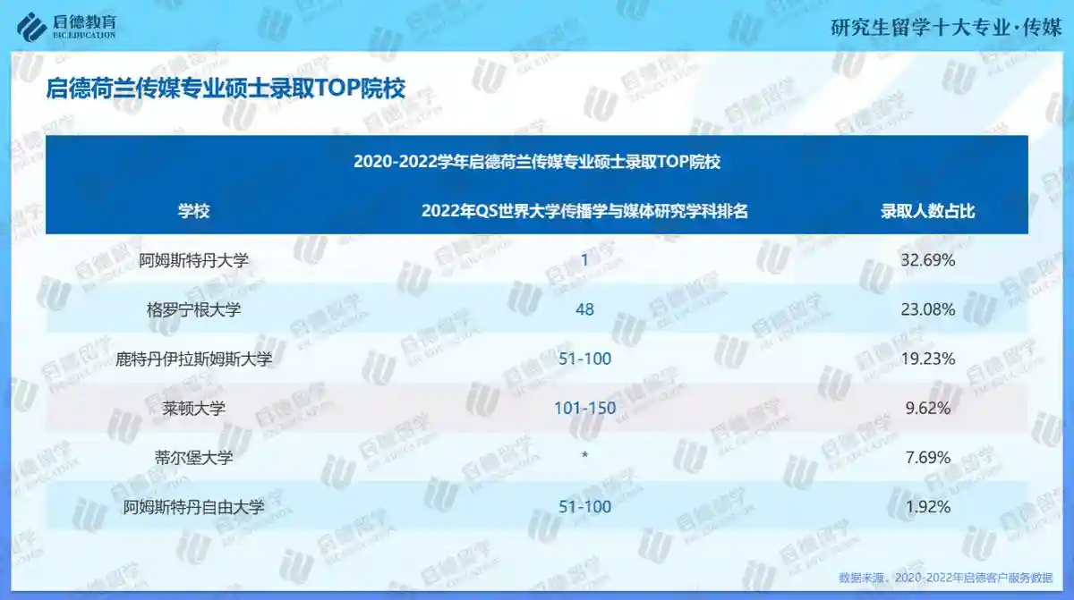 作为欧洲的媒体传播中心,阿姆斯特丹是荷兰全国媒体的集中地带,Netflix(网飞公司)欧洲总部就落脚在此。阿姆斯特丹大学的传播学及媒体研究专业常年在QS世界大学学科排名中位居第1位。启德留学客户服务数据显示,2022年荷兰传媒硕士录取前五院校分别为阿姆斯特丹大学、格罗宁根大学、鹿特丹伊拉斯姆斯大学、莱顿大学、蒂尔堡大学。