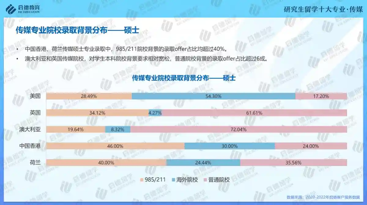 硕士留学阶段传媒专业亦为热门,海外院校录取难度相对较低