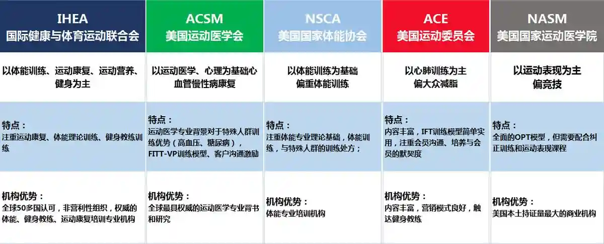 在职业运动相当兴盛的美国,为了维护联盟运作以及附带的庞大商机,对于运动科学的研究与管理都相当重视,间接来说也促进了民众对体能的认知。美国国际最具权威的认证机构是IHEA国际健康与体育运动联合会(InternationalHealthandExerciseAssociation)、美国医学学会(ACSM;AmericanCollegeofSportsMedicine)美国国家肌力与体能协会(NSCA;NationalStrengthandConditioningAssociation)美国国家运动医学学院(NASM;NationalAcademyofSportsMedicine)美国运动委员会(ACE;AmericanCouncilofExercise)