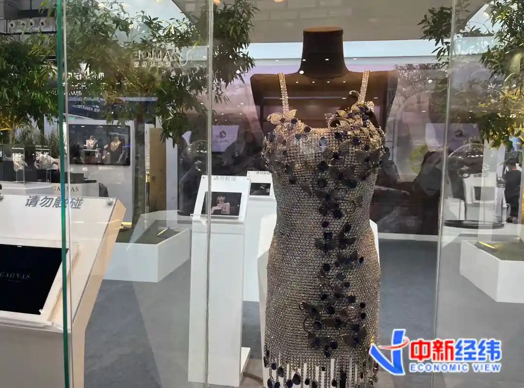 2号场馆内,一件金缕钻衣吸引了不少人观赏。珠宝品牌高纳仕有关负责人在接受中新经纬采访时介绍,这整件衣服是由19650颗白钻,还有3000多颗蓝钻组成,全手工镶嵌,制作周期长达2年18天,此次在消博会上展出为全球首发。