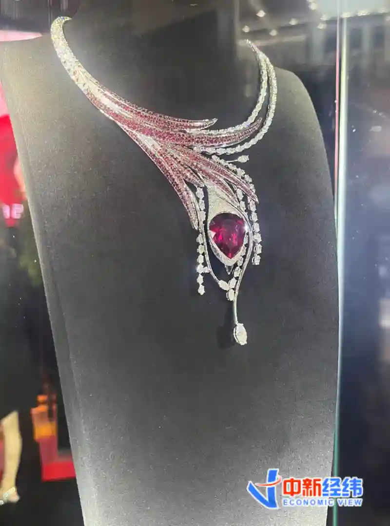 这届消博会上,不少珠宝商都展出了自家最耀眼的珠宝。在时尚珠宝展区的拉威尔艺术珠宝展区中,展示了全球首发限量1件的年度主题艺术珠宝——神话系列“朱雀”高级彩宝钻石项链。