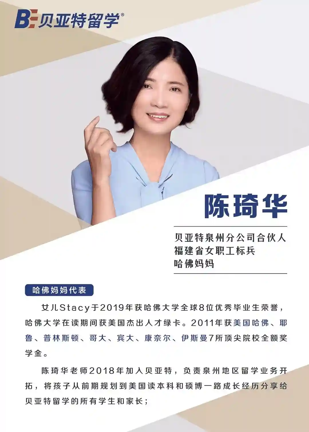 贝亚特拥有福建地区最专业和最有经验的顾问团队和文书团队,对于国内学生申请海外名校有着深厚独到的见解和丰富的资源,致力于为出国留学的家庭和学生提供综合解决方案和全套留学服务。