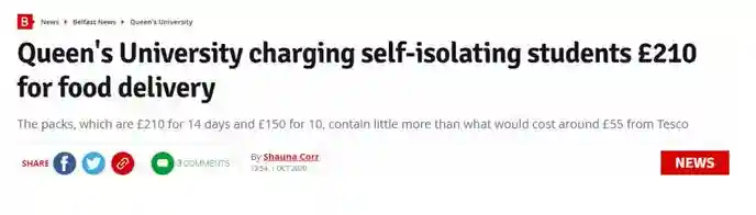 贝尔法斯特女王大学提供两种隔离包,210镑/14天和150镑/10天。但是从Tesco定的话只需要55镑左右。