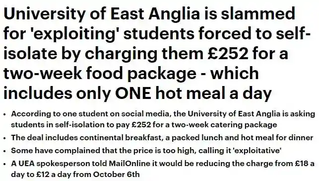 这样的话,隔离14天就是420英镑。学生表示,比从Ubereats或者Deliveroo上点外卖还要贵。