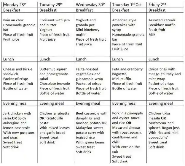 除了上面这个25镑的速食包,该校还向学生提供30镑一天的热食套餐:早中晚三餐分别是典型西式早餐(热饮和面包或者谷物),学校食堂的午餐和readymeal(加热即可食用)的晚餐。
