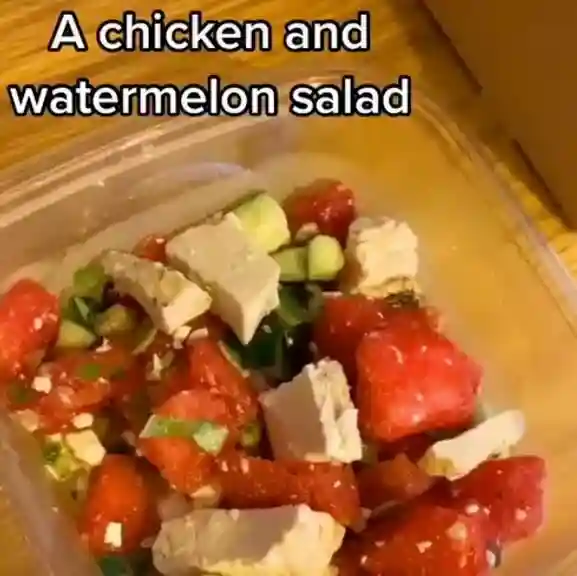 如果说上面的素食餐包有点惨,那这个“chickenandwatermelonsalad”就更厉害了,能不能对食物有最起码的尊重!