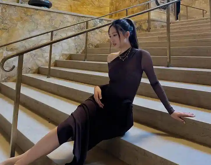 她坐在楼梯上摆拍,曾登上杂志封面的她,凹起造型来很是专业,举手投足之间范儿十足,一点不输娱乐圈中的明星。