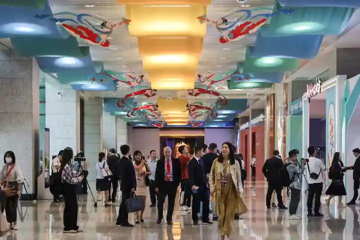 2023年9月6日,与会嘉宾在第六届丝绸之路(敦煌)国际文化博览会上参观。新华每日电讯记者马希平摄