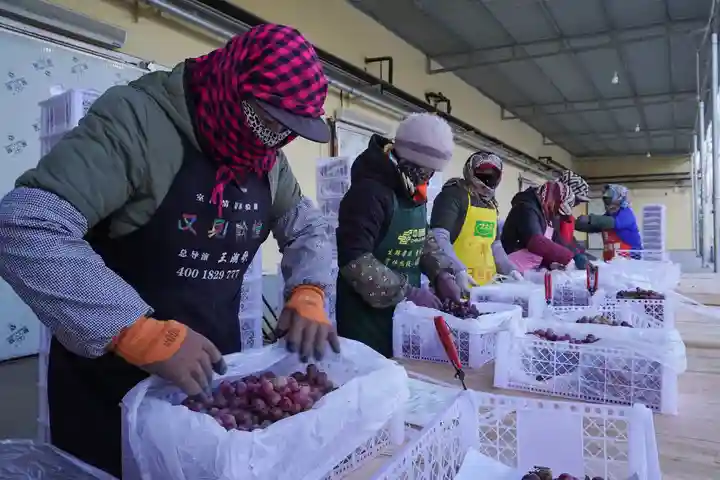2024年1月22日,在位于甘肃省敦煌市的甘肃本源兴农产品有限责任公司,工人在包装红提葡萄。新华每日电讯记者马希平摄