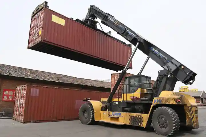 2023年4月12日,在甘肃物流集团张掖市捷安物流有限责任公司,作业车辆装卸进口大麦集装箱。新华每日电讯记者范培珅摄