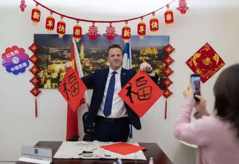 昨日,成都商报-红星新闻记者来到以色列驻成都总领事馆,对潘立文进行专访。辞旧迎新,领事馆的会议室里已经贴上祝贺新春的福字剪纸,桌上备着鹰嘴豆酱、饼等以色列传统食品,以及笔墨与红色的斗方纸。