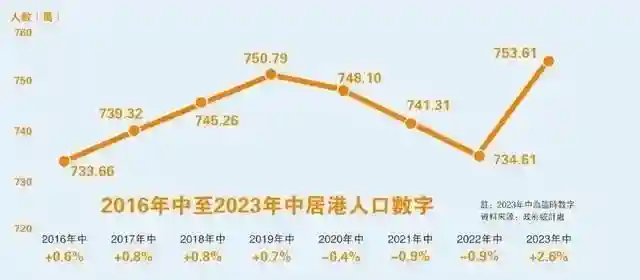 据香港入境处公布的数据显示,香港2023年全年各类输入人才计划申请超过22万宗,其中,有13.5万人获批香港身份(非永居)。内地人口的及时“补给”,让已经连续三年人口数下跌的香港,一举重回75万人。