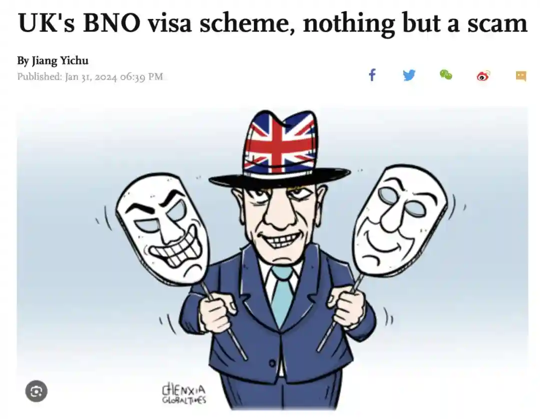 今年1月,《GlobalTimes》刊出了标题为《英国的BNO签证计划只不过是一场骗局》的文章,文章指出持BNO赴英的香港居民面临诸多困难,包括失业和就业不足、语言障碍、种族歧视、高额税收等。