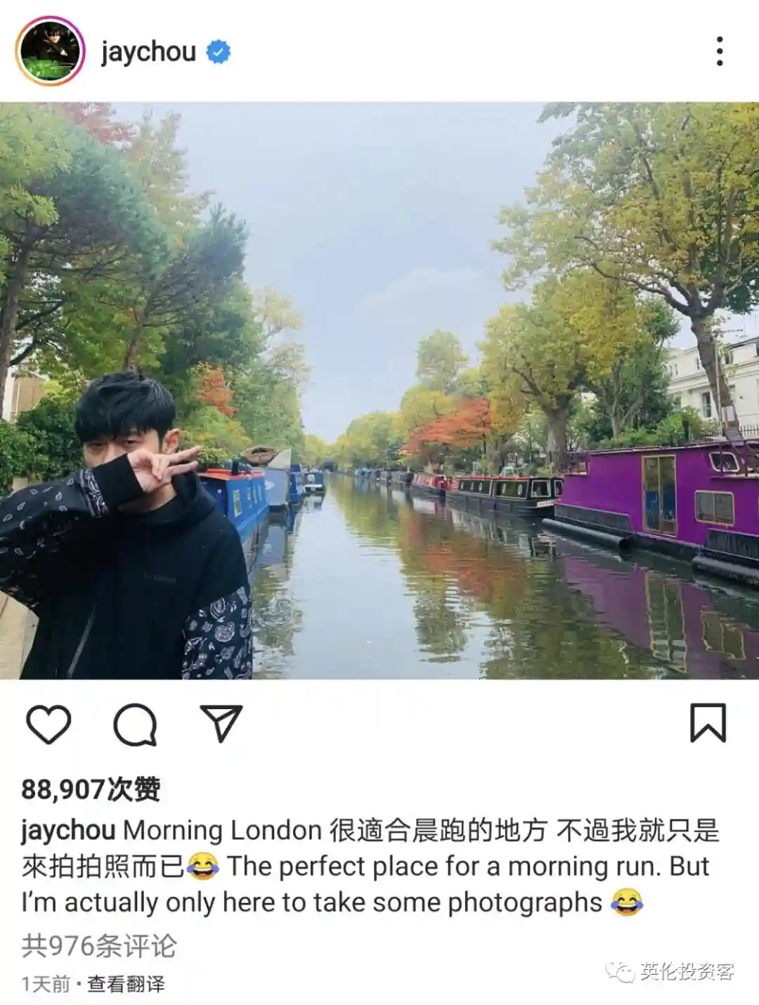 随后,他还po出在英国美术馆看展、在运河边和海德公园的照片,并在线问英国的fans有什么好吃好玩的。