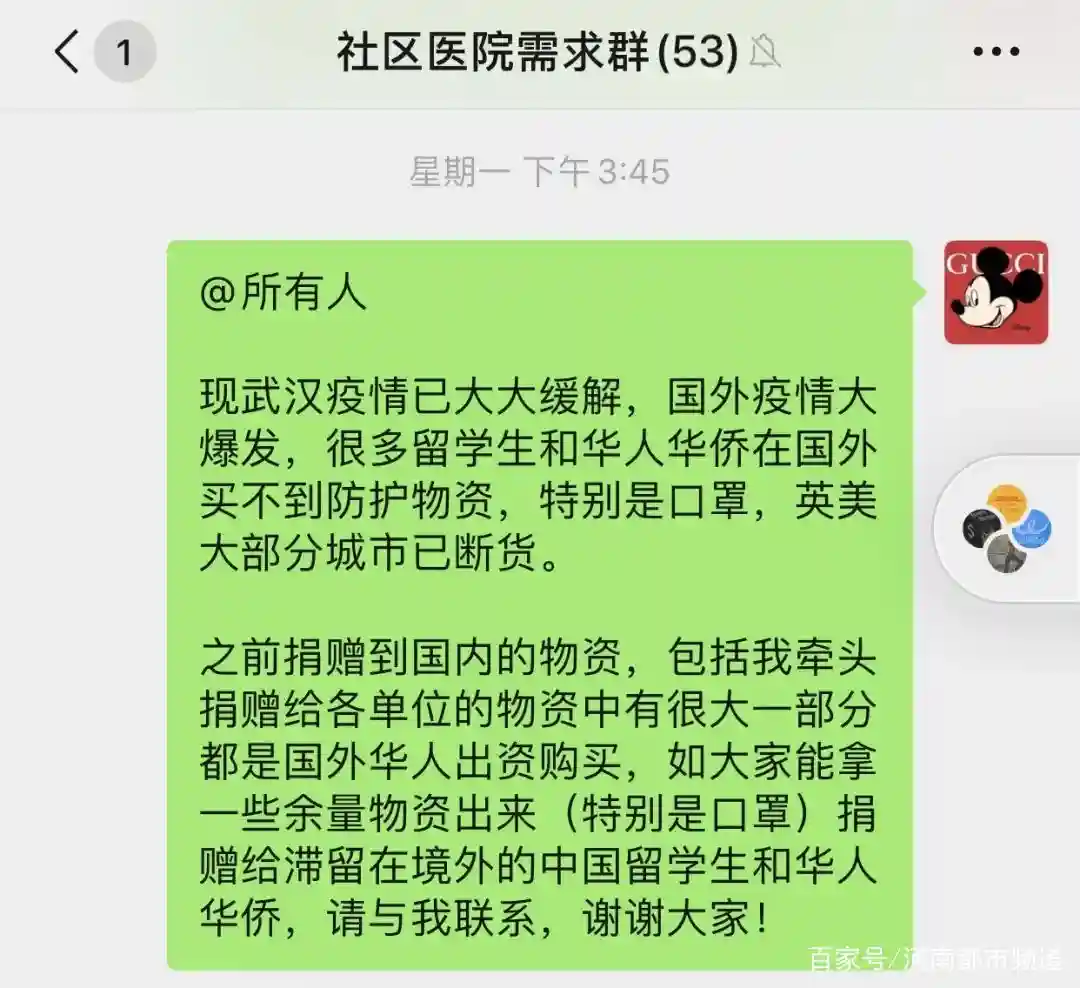 “现武汉疫情已大大缓解,国外疫情大暴发,很多留学生和华人华侨在国外买不到防护物资,特别是口罩,英美大部分城市已断货。之前捐赠到国内的物资,包括我牵头捐赠给各单位的物资中有很大一部分都是国外华人出资购买,如大家能拿一些余量物资出来(特别是口罩)捐赠给滞留在境外的中国留学生和华人华侨,请与我联系,谢谢大家!”他在微信群内发布消息说。