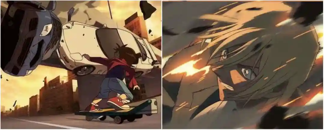 静野孔文执导的剧场版风格,极为突出地体现在了快节奏的、很“燃”的动作场景。他成为导演的第一部剧场版,即被视为“转型开端”的《沉默的15分钟》,在最开始就是一段柯南发现隧道即将爆炸、在车流之间快速逆行的滑板戏。